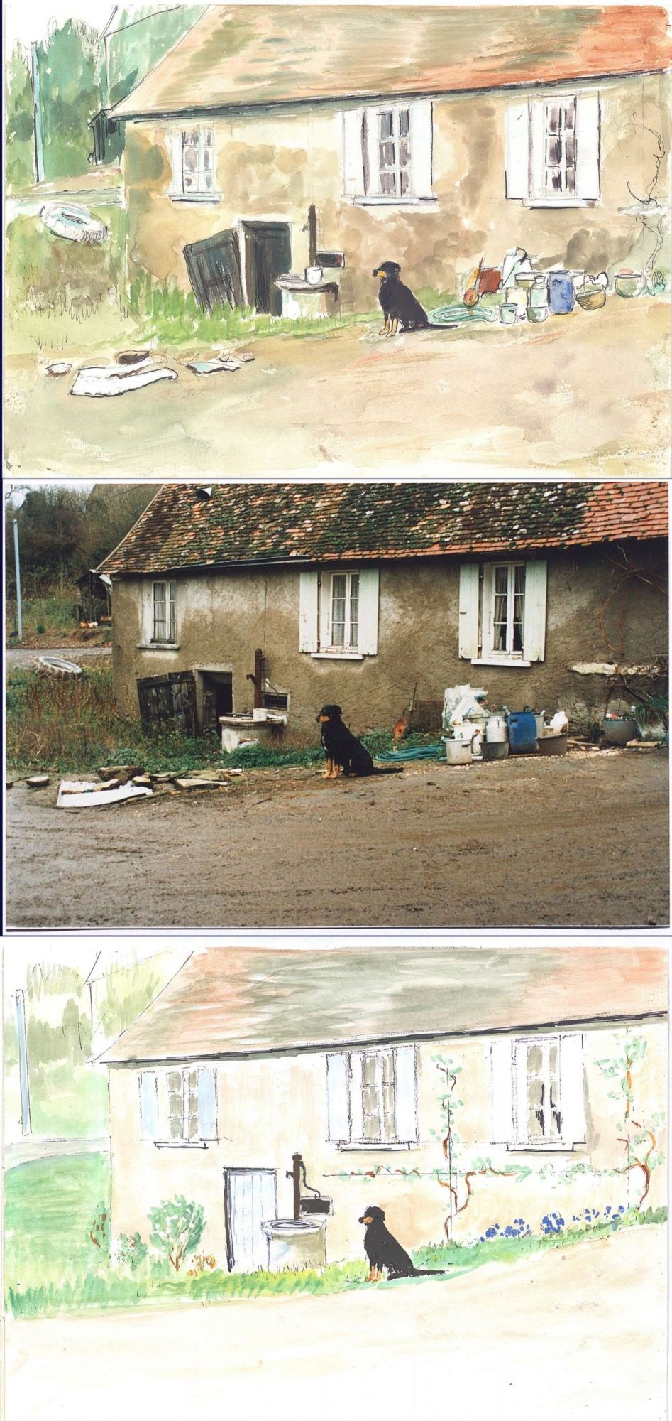 Dans le cadre d’un projet de valorisation du cadre de vie des exploitations agricoles dans l’Indre, le service environnement a constitué tout un dossier de « réflexions » qui s’accompagne de photographies et de dessins. Ceux que nous avons ici sélectionnés concernent une ferme du canton d’Écueillé. Les aquarelles ont été peintes par René Pêcherat d’après les photographies.