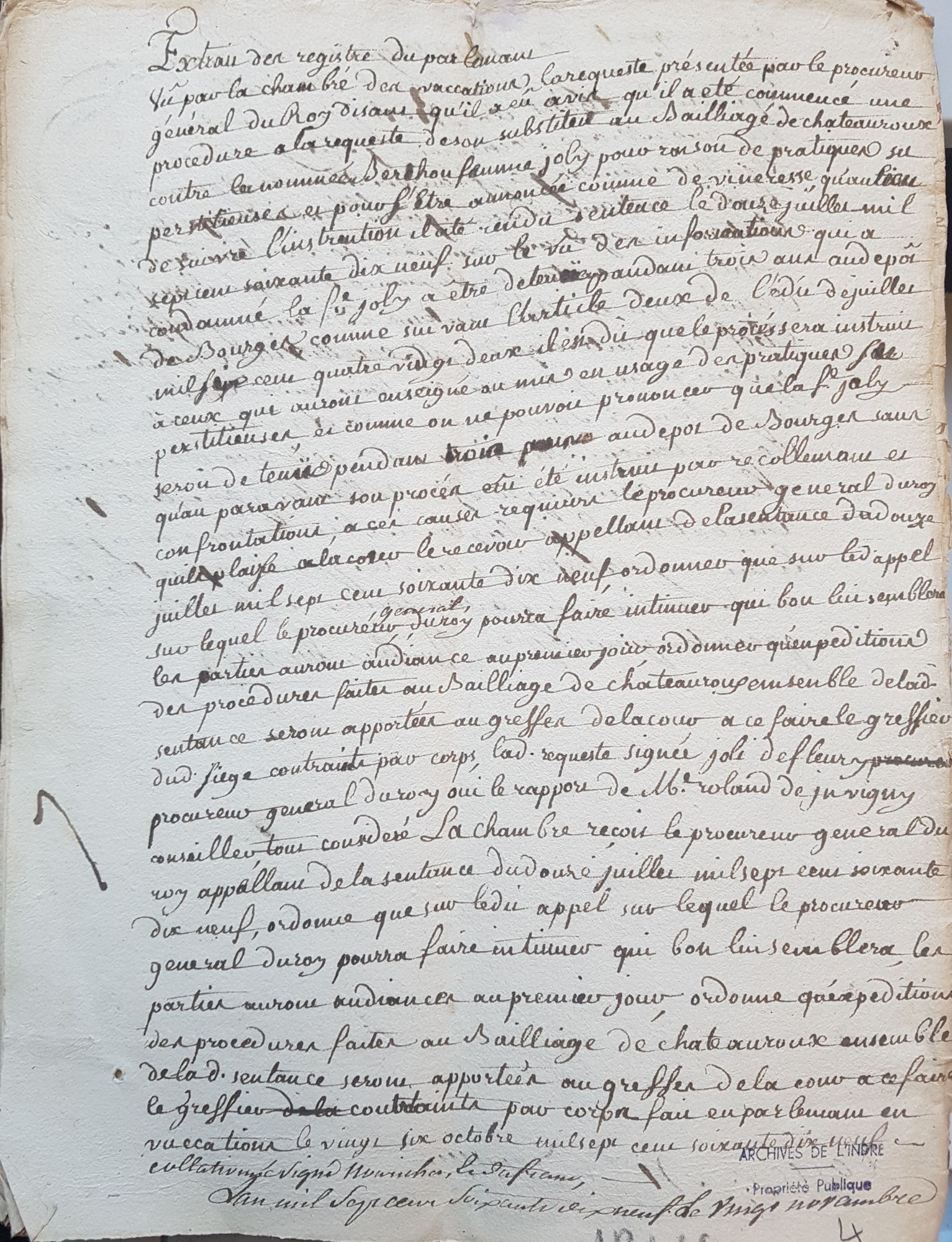 Le 12 juillet 1779, le procureur du Roi condamne Anne Berthon à trois ans de réclusion au dépôt de Bourges. Cette berrichonne, mariée à un certain Benoît Jolly, marchand à Levroux, est accusée de pratiques superstitieuses et pour être annoncée comme devineresse.