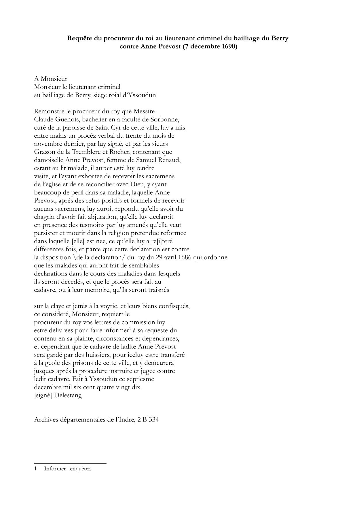Un autre procès du 11 décembre 1690 est intenté à la mémoire d’Anne Prévost, femme de Samuel Renaud, elle aussi déclarée protestante relapse. Au curé venu lui administrer les derniers sacrements, elle répond "qu'elle avoit du chagrin d'avoir fait abjuration, q'elle luy déclaroit [...] qu'elle veut persister [à refuser l'extrême onction] et mourir dans la religion prétendue réformée dans laquelle est née". En application de la déclaration du roi du 29 avril 1686, la sentence du lieutenant criminel du bailliage d'Issoudun condamne son cadavre à être attaché à une charrette, traîné à travers la ville puis jeté à la voirie. On lui refuse ainsi le droit d’être enterrée et d’avoir une sépulture.