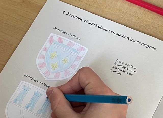 Les élèves découvrent grâce à un livret la formation du blason : les formes, les couleurs, les ornements puis ils "blasonnent" tout au long du petit cahier. Ils pourront ensuite en classe réaliser leur propre blason ou celui de la classe.