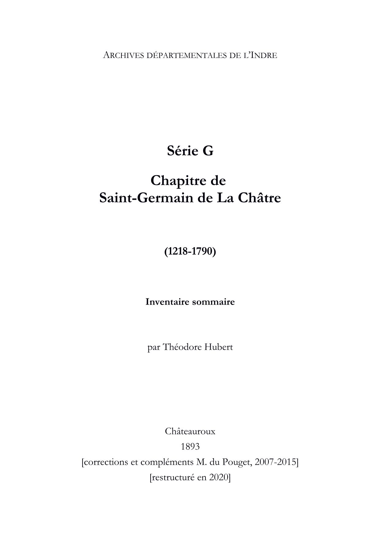 Fondé par les seigneurs de Châteauroux, seigneurs de La Châtre, au Moyen Âge, le chapitre de Saint-Germain bénéficia de leurs libéralités. En 1264 les statuts du chapitre furent dressés par Jean de Sully, archevêque de Bourges. Ce fonds remontant au XIIIe siècle comprend notamment un inventaire des titres du chapitre du XVIe siècle (G 68), un compte des recettes du chapitre du XIVe siècle par Guillaume Belleton, chanoine (G 85), plusieurs articles concernant la chapelle de Vaudouan, qui appartint au chapitre (G 93-101). Il convient également de noter que quelques articles concernant le couvent des Carmes de La Châtre fondé au XIVe siècle, se trouvent intégrés à ce fonds (sur ce couvent, voir H 563-572).