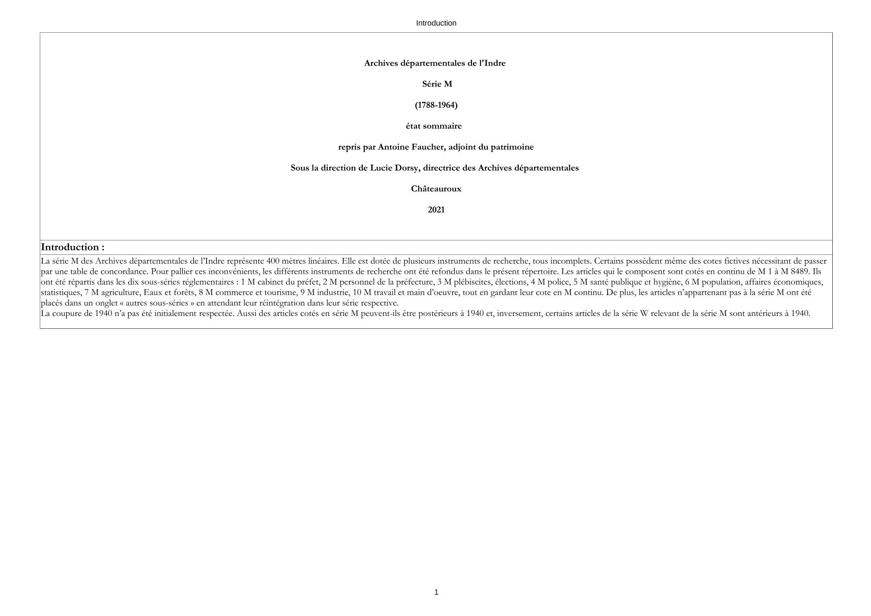 La série M de l'Indre, cotée depuis l'origine en continu (cotation du type M 1, M 2, etc.) et dotée d'analyses succinctes, a fait l'objet à partir de 1956 de plusieurs tentatives de recotation destinées à réorganiser les documents par sous-séries réglementaires. En 1969 et dans les années 1980, on réintégra en série M des registres et des liasses de correspondance initialement classés en série K. Au cours de ces opérations, des cotations "virtuelles" (du type 2 M 1) furent attribuées aux articles, qui restaient cependant cotés en continu en magasin. Par ailleurs, de nombreux documents relevant de la série M et tardivement entrés aux Archives départementales ont alors été intégrés aux archives contemporaines, où ils se trouvent toujours conservés.