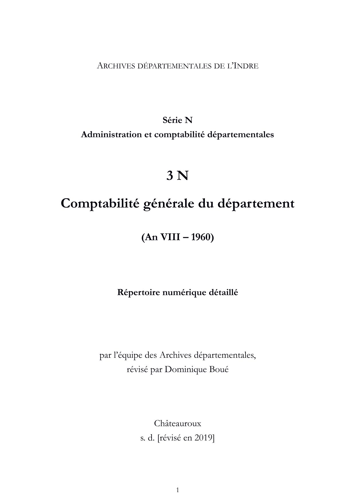 Très complémentaires des documents conservés en série M, les archives de l'administration départementale sont tout aussi essentielles pour l'histoire du département de l'Indre. La série N de l'Indre est cotée en continu mais suit globalement l'ordre des sous-séries du cadre de classement réglementaire :