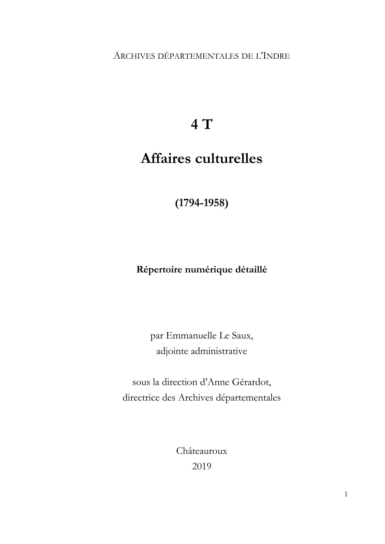 La sous-série 4 T contient les fonds des établissements de culture et de loisir du département, tels que bibliothèques, théâtres et musées, mais également des dossiers relatifs aux monuments historiques et aux sites, aux fouilles archéologiques, aux sociétés savantes, artistiques et littéraires. Elle est, dans l'Indre, particulièrement riche en ce qui concerne les monuments historiques, pour lesquels on trouvera de nombreux dossiers classés par communes.