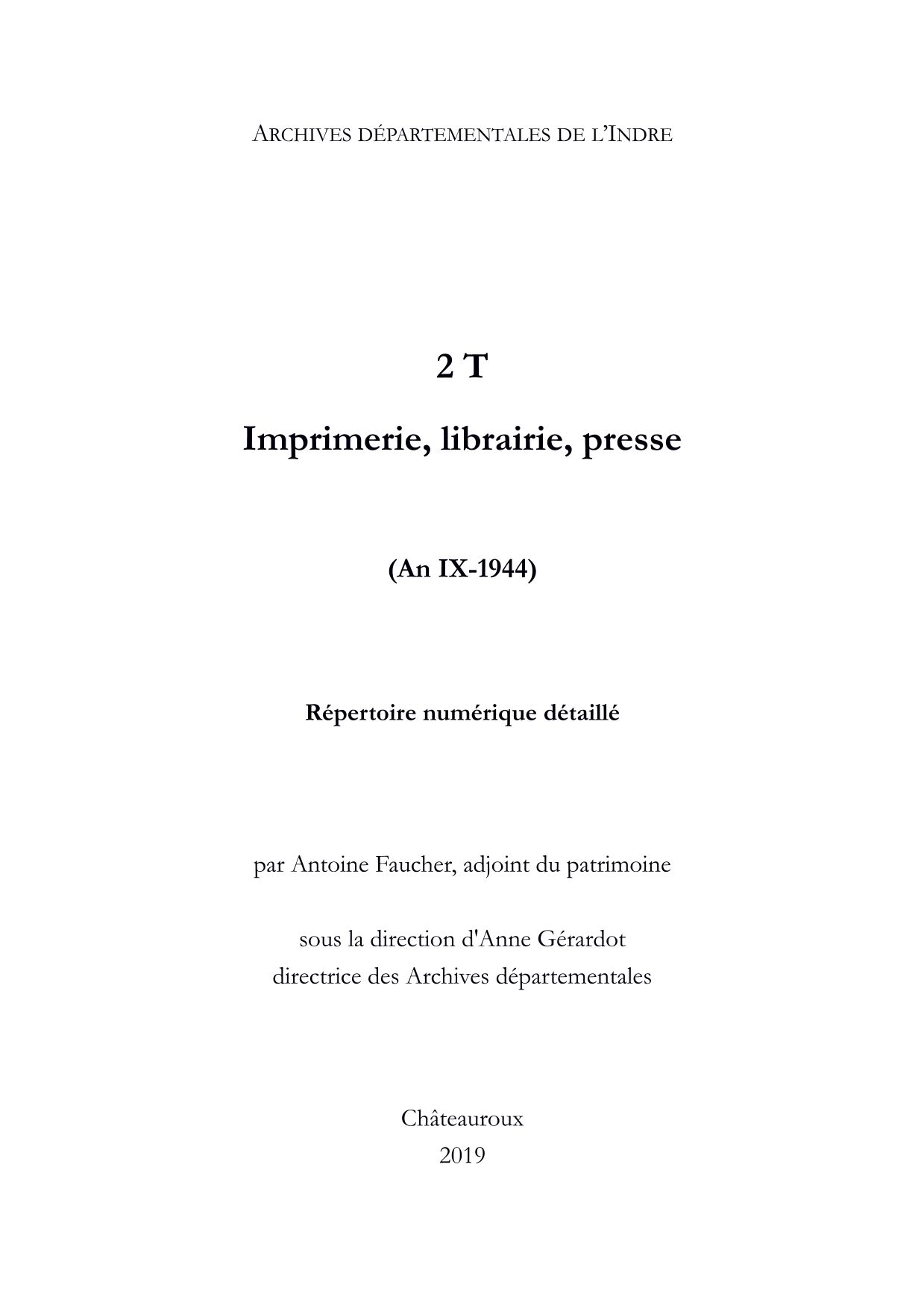 La sous-série 2 T regroupe les archives du contrôle de la préfecture sur les métiers du livre (imprimerie, librairie, colportage), la presse et la procédure de dépôt légal. On y trouve également les archives du service régional de la censure de Châteauroux pendant la Seconde guerre mondiale. Cette sous-série constitue la principale source pour l'étude des métiers du livre et de l'écrit au XIXe siècle.