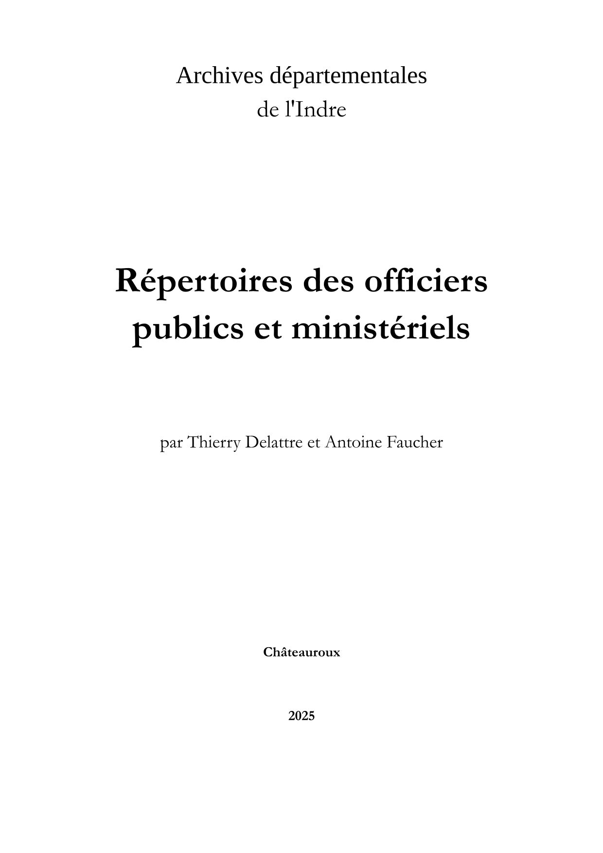 Cette sous-série est destinée à recevoir les dossiers intéressant les officiers publics et ministériels (notaires, commissaires-priseurs, huissiers et avoués). Dans l'Indre elle n'est, de fait, constituée que de répertoires de notaires classés par arrondissement, commune, puis étude, ainsi que de quelques répertoires de commissaires-priseurs, également classés par arrondissement). Chaque arrondissement fait l'objet d'une sous-sous-série distincte.