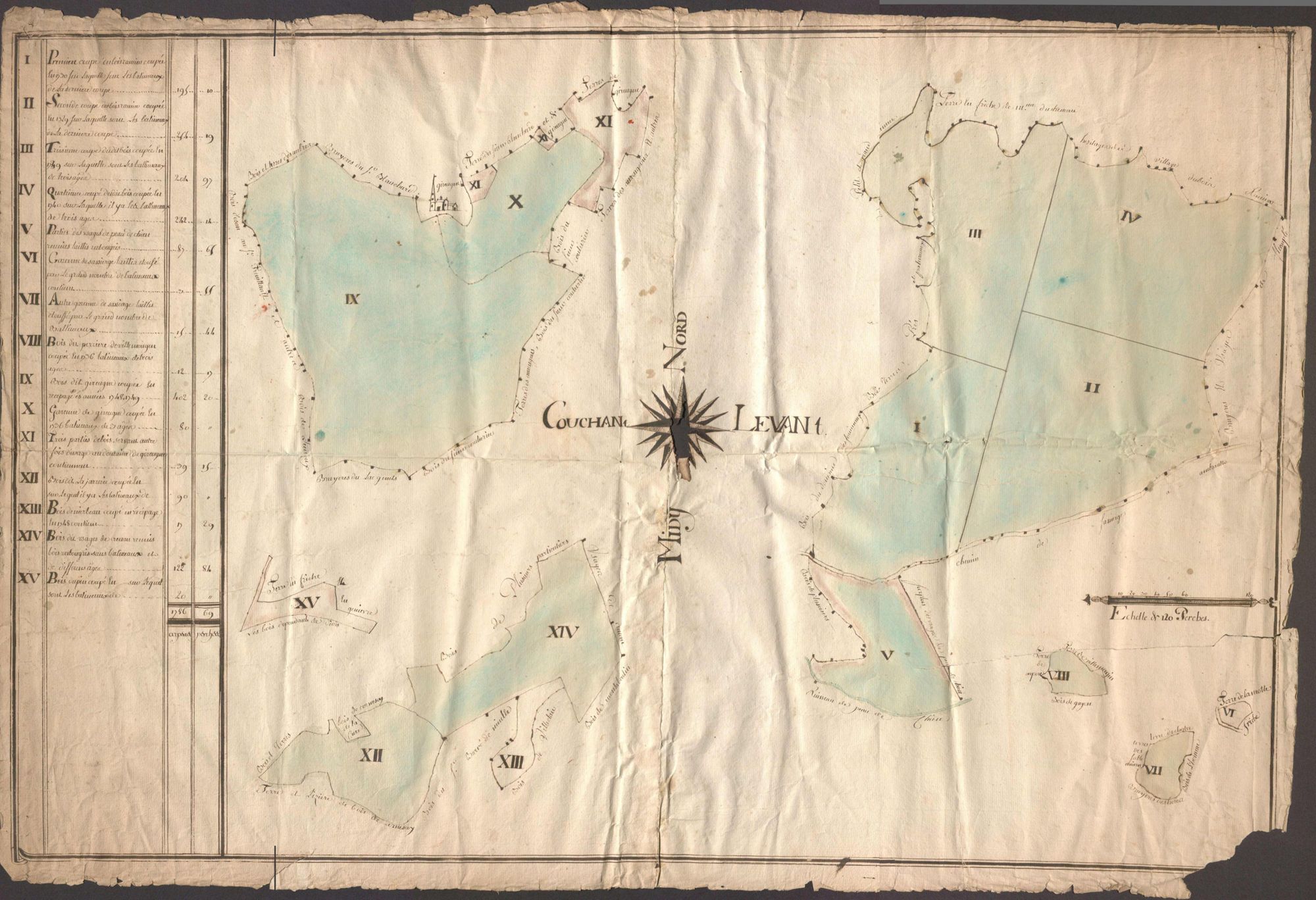 - Plan aquarellé de bornage du bois de Gireugne, copié d'après l'atlas des bois de Châteauroux ([1785], an X).
