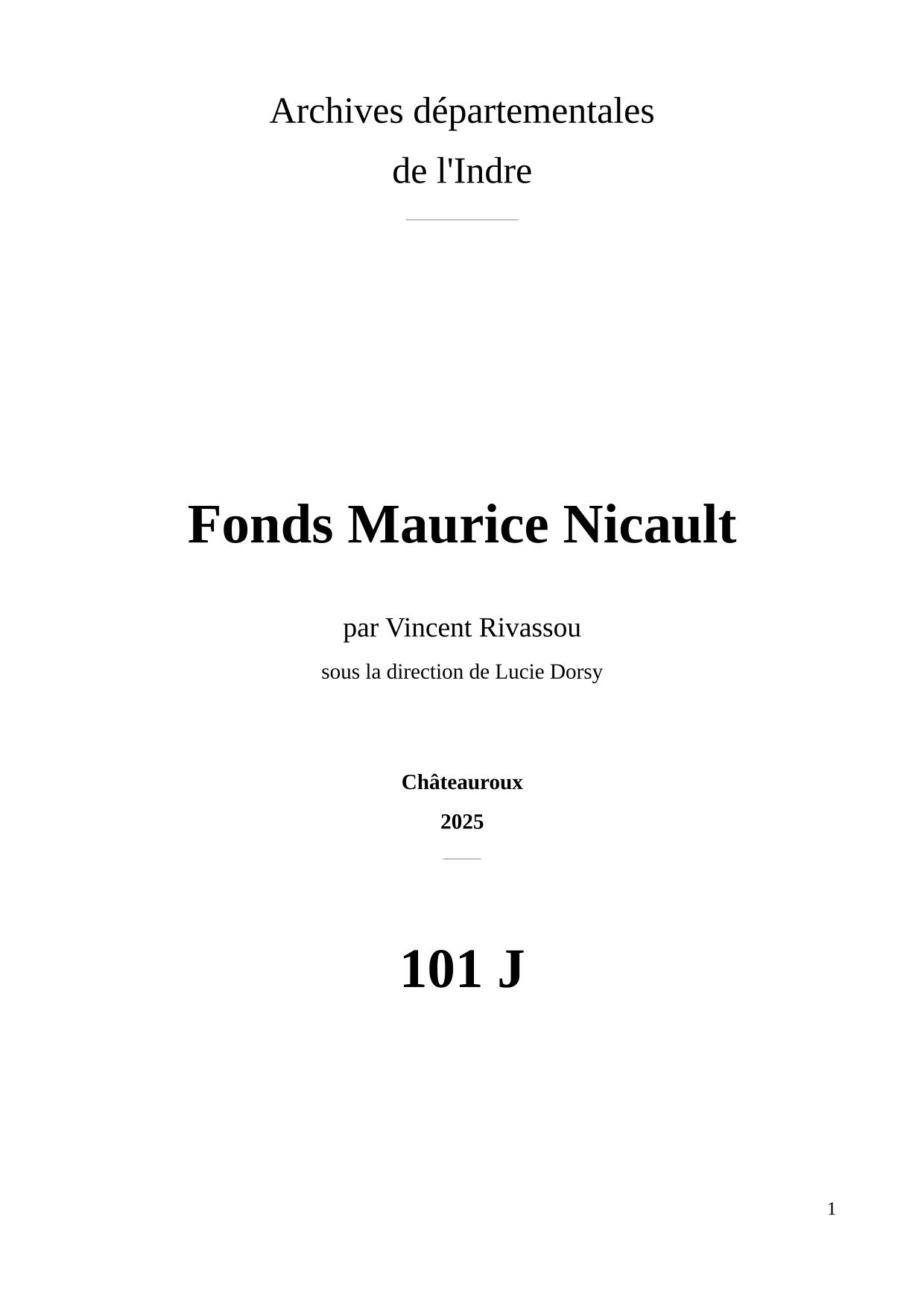 Le fonds contient les papiers liés à ses travaux et recherches ainsi que de nombreuses photographies (originales ou copies). Le chercheur trouvera par ailleurs dans l'instrument de recherche une riche introduction évoquant l'historiographie de la seconde guerre mondiale dans l'Indre, ainsi que la bibliographie des écrits de Maurice Nicault.