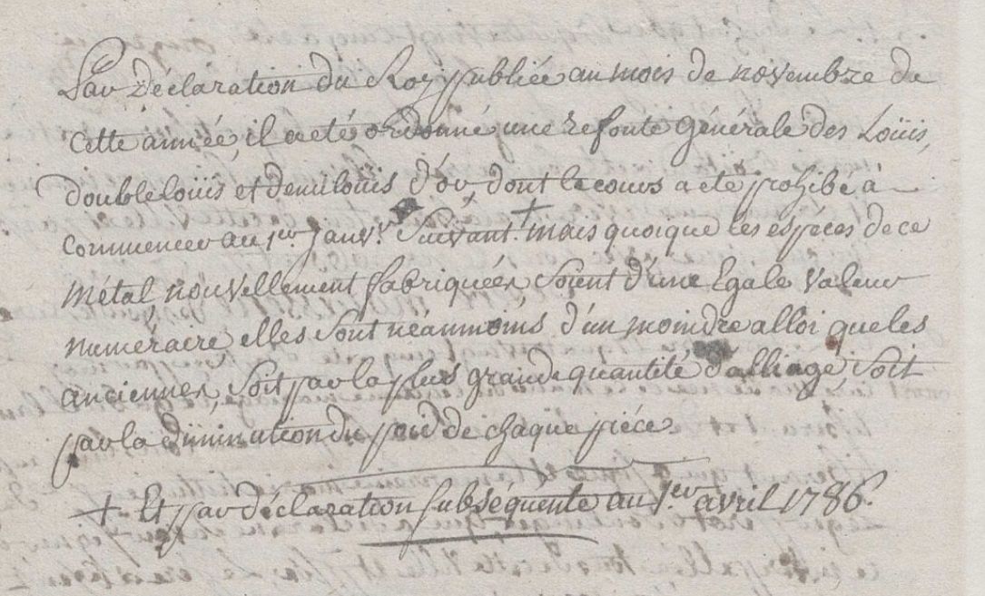 En 1785, le contrôleur général des Finances Calonne décide de refondre la monnaie d’or. On frappe alors entre 1786 et 1787 plus de 700 millions de livres à l’effigie de Louis XVI. C’est une « révolution monétaire » tant le chantier est énorme et complexe. Concrètement, cette réforme augmente le rapport de l’or et de l’argent de 1 à 15,5 contre 1 à 14,5 depuis 1726. Cette « révolution monétaire » dure jusqu’en 1928, exemple rare de longévité et de stabilité. Événement dont plusieurs curés soulignent l’importance, notamment les curés de Sazeray et de Sainte-Sévère-sur-Indre.