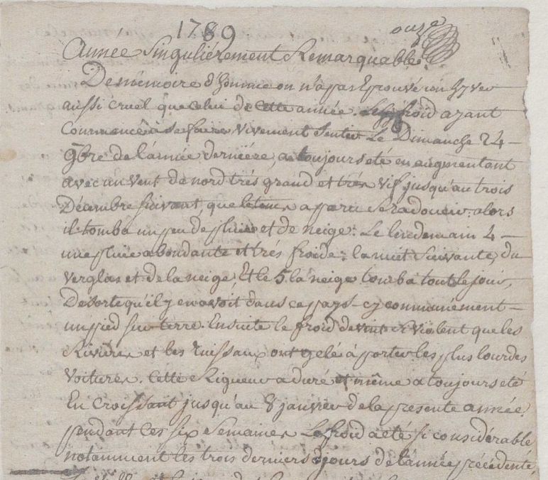 Il est à remarquer que cet hiver 1789 a frappé par sa longueur et sa dureté toute la province de Berry (nous l’avons vu à Palluau ou encore à Vouillon). L’hiver long était redoutable dans le sens où la « soudure » était impossible. Souvent après une mauvaise récolte due à un accident climatique, un gel tardif et surtout un printemps et un été pluvieux, le stockage et la spéculation font grimper le prix du pain, en particulier à l’approche de « la soudure », dans les semaines voire dans les mois précédent la récolte suivante.