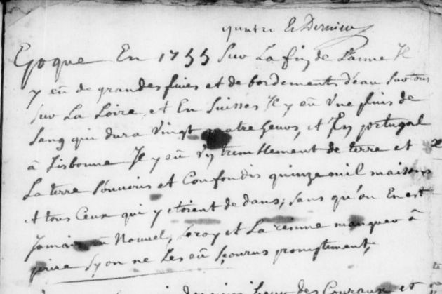 Le 1er novembre 1755, jour de Toussaint, au Portugal, très catholique, la ville de Lisbonne est tourmentée par un grand séisme que l’on ressent jusqu’à Venise. Il provoque aussitôt un immense incendie qui devait durer six jours. Une énorme vague submerge le port, détruisant les maisons et tuant des habitants fuyant en bateau sur Le Tage. La ville est détruite aux trois quarts, et on compte environ 20 000 morts. Ce désastre extraordinaire est rapporté partout en Europe, à l’instar de Voltaire dans son Poème sur le désastre de Lisbonne, et jusqu’en Berry, à Thevet-Saint-Julien.