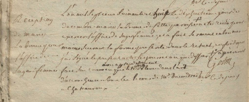 d’élève dans l’art d’accoucheuse sous les leçons de Mme Ducoudrai à Châteauroux, a été reçue pour