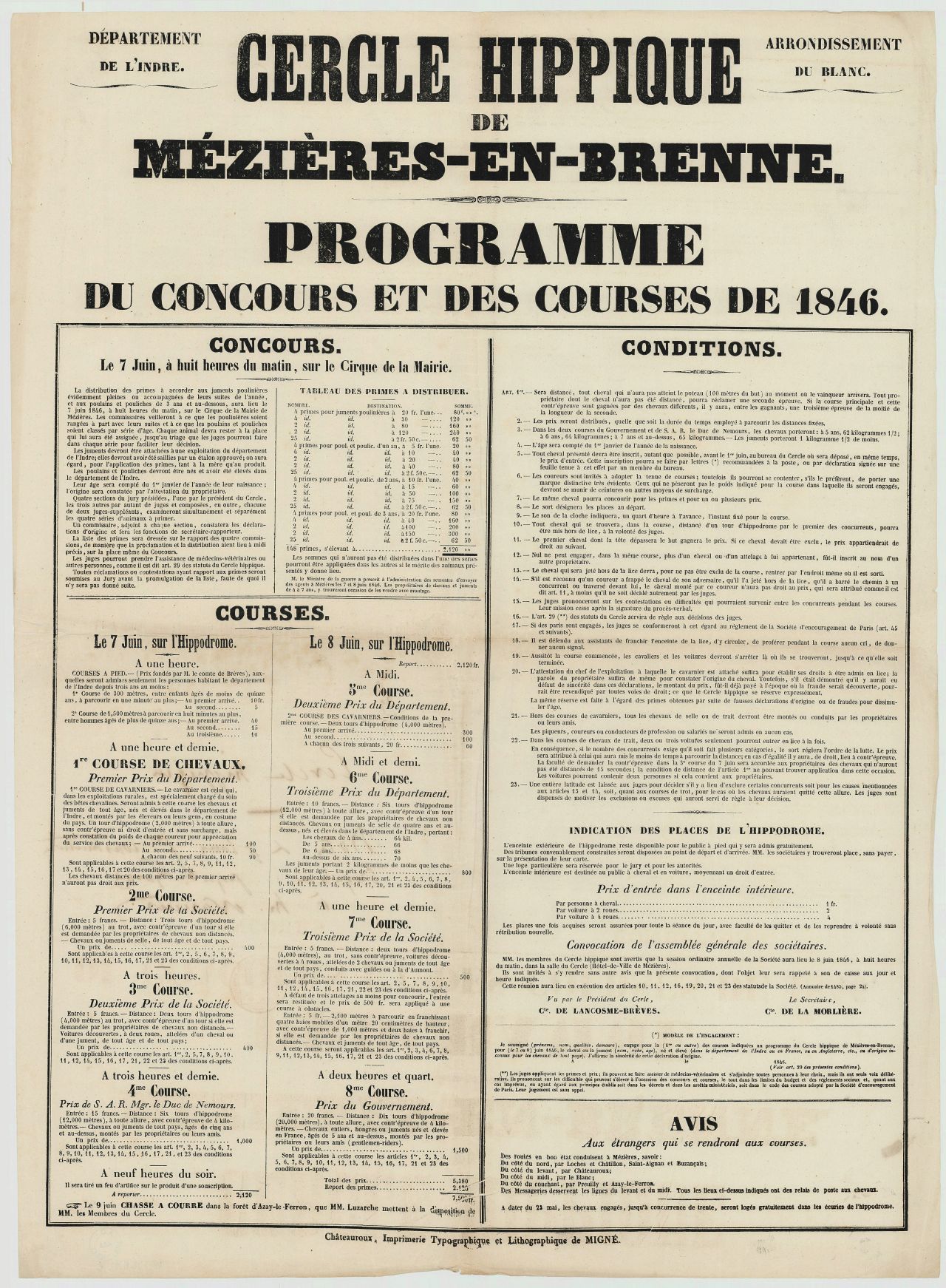 Pour lancer les courses, les fondateurs comptent sur « l’influenceuse » George Sand, mission qu’elle remplit en 1846 en publiant Les courses de Mézières-en-Brenne, un manuscrit d’une vingtaine de pages. C’est l’année de l’apothéose : l’article paraîtra presque simultanément dans L'Éclaireur de l'Indre du 4 juillet et Le Constitutionnel (sous la rubrique « Journal d'agriculture ») du 6 juillet 1846, avec quelques variantes, sous le titre « Le Cercle hippique de Mézières-en-Brenne par un habitant de la Vallée Noire ». La Bonne Dame de Nohant décrit par ailleurs la campagne brennouse comme « un plateau uni, triste, malsain et pauvre ». Mais la notoriété des courses permettrait le développement des voies de communication pour l’Indre et la Brenne. Pour accueillir au mieux les visiteurs, on projette la construction de l’Hôtel du Cercle hippique rue de la Lanterne à Mézières-en-Brenne. Mais les émeutes de la faim en 1847 conduisent au report des courses en septembre, tandis que les années 1848 et 1849, trop agitées, voient les courses annulées. Certes 1850 est une très belle année, cependant le glas semble sonner : les années suivantes marquent le pas, par une désaffection populaire. Les courses hippiques de Mézières-en-Brenne s’achèvent en 1857 dans la quasi-indifférence.