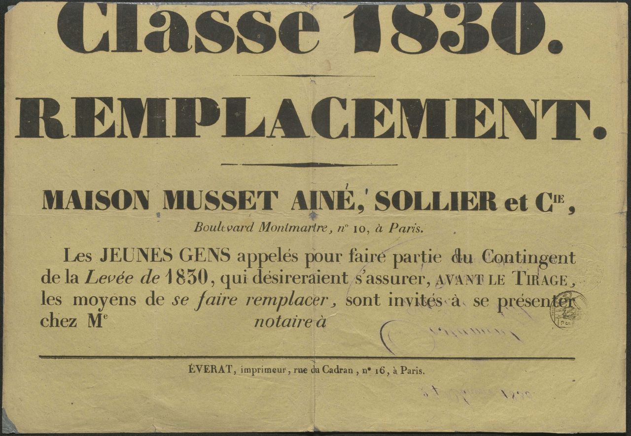 La rencontre directe entre le remplacé et le remplaçant est rare. Elle s’opère généralement par le biais d’un intermédiaire : notaire, courtier ou, comme le présentent plusieurs affiches, par une compagnie d’assurance. Les avantages pour les deux parties sont nombreux. Pour le remplacé, en contrepartie du paiement d’une somme effectué avant le tirage au sort, il évite d’interrompre ses études, le début d’une carrière ou un projet de mariage. De plus, il échappe aux risques de fatigue du service ou à ceux liés à la guerre. Le remplaçant tire lui aussi avantage de ce système puisqu’il lui permet de gagner de l’argent pour aider sa famille, acheter une terre, payer ses dettes. En 1855, la possibilité de payer pour se faire exonérer sans avoir de remplaçants est offerte mais faute d’hommes, on revient au système de remplacement en 1868.
