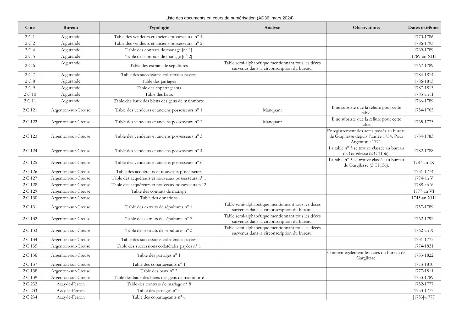 Les tables des "Insinuations et contrôle des actes notariés" de la sous série 2 C (1719-an XIII) ainsi que les registres de déclarations de mutation du bureau de Levroux (1867-1889) et une table alphabétique des successions et absences du bureau de Valençay de la sous série 3 Q sont en cours de numérisation.