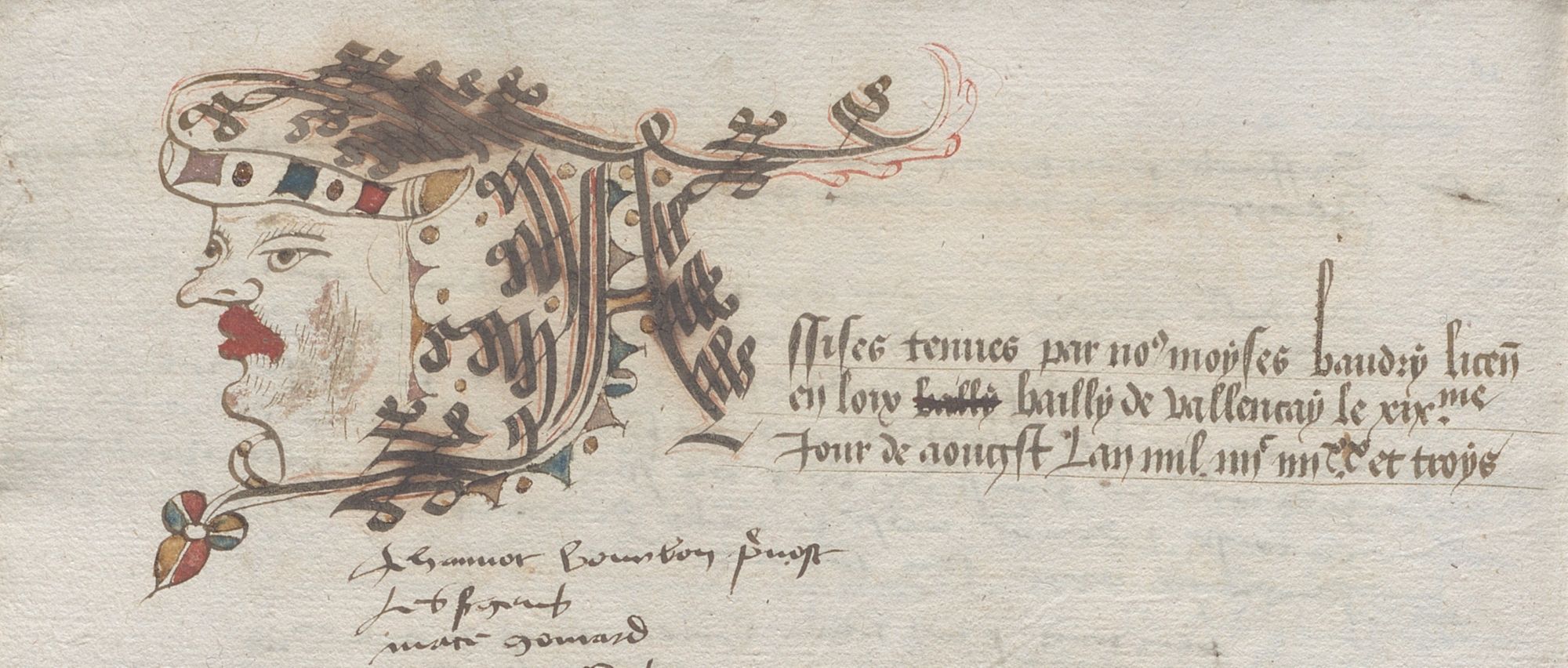 Le registre des plaids de la châtellenie de Valençay est un cahier dans lequel sont enregistrées les affaires plaidées devant le bailli : un bref résumé du contexte et des accusations, suivi du jugement rendu aux parties, en général la condamnation à une amende. Il fait cependant figure d’exception dans les fonds des Archives de l’Indre en raison des ornementations qu’il contient. Ce témoignage particulier de la fin du Moyen Âge met en valeur les qualités du greffier qui a dessiné des visages et calligraphié des vers latins humanistes au début du registre : « Sois libre de passion comme si jamais tu ne devais mourir/ Eloigné du vice comme si demain la vie te faisait défaut ».
