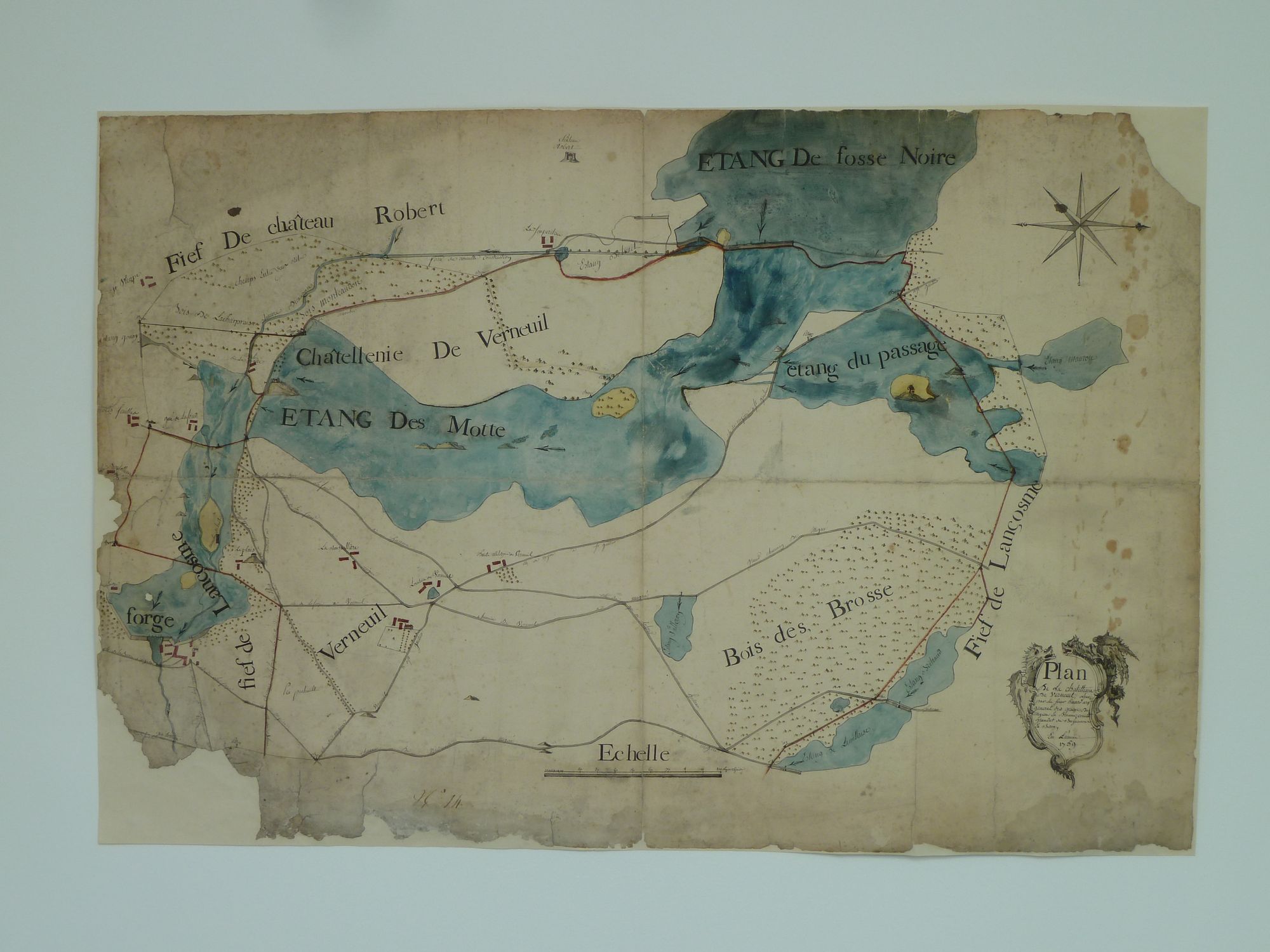 Daté de 1759, le plan de la châtellenie de Verneuil est dressé par l’arpenteur du comté Grandat de Buzançais dont elle dépend. Il permet d’avoir un aperçu sur les étangs, bois et chemins dépendant du seigneur du lieu. On y repère les vestiges de la motte castrale de Verneuil, situés à l’extrémité de la chaussée de l’étang qui porte son nom. Cette motte est citée dès 1426. Ce plan témoigne également de l’habitat dispersé et des industries qui vivent le long des rivières et canaux : les moulins, mais aussi la forge de Lancôme, dont les marteaux sont actionnés par la force de l’eau, concentrée grâce à un barrage construit à l’extrémité de l’étang.
