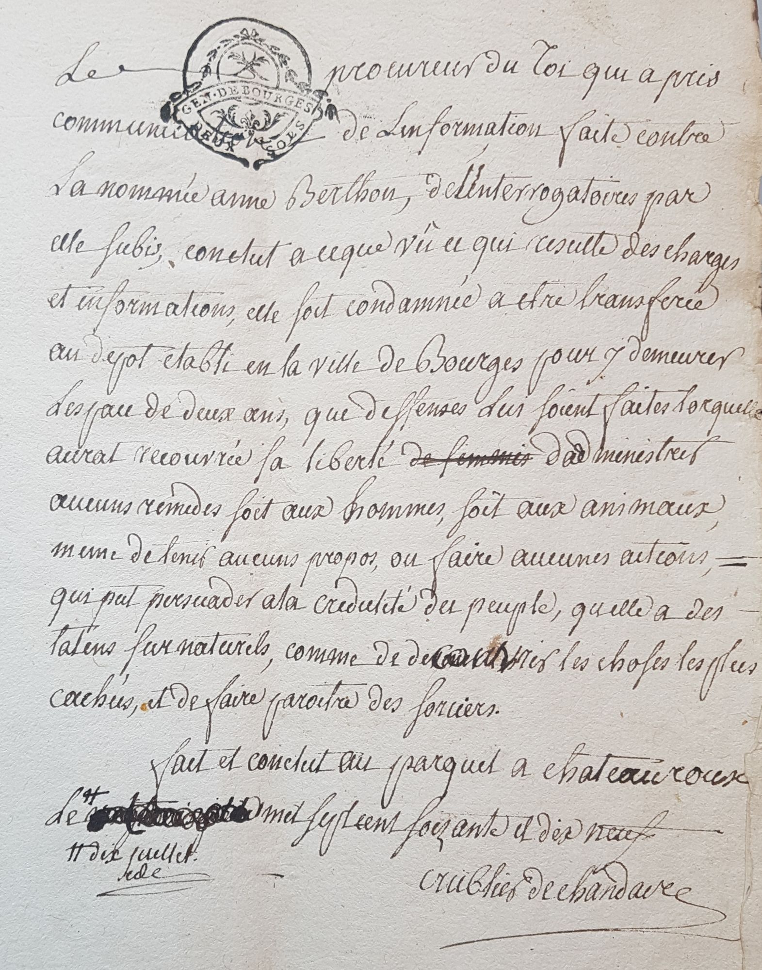 Le 12 juillet 1779, le procureur du Roi condamne Anne Berthon à trois ans de réclusion au dépôt de Bourges. Cette berrichonne, mariée à un certain Benoît Jolly, marchand à Levroux, est accusée de pratiques superstitieuses et pour être annoncée comme devineresse.