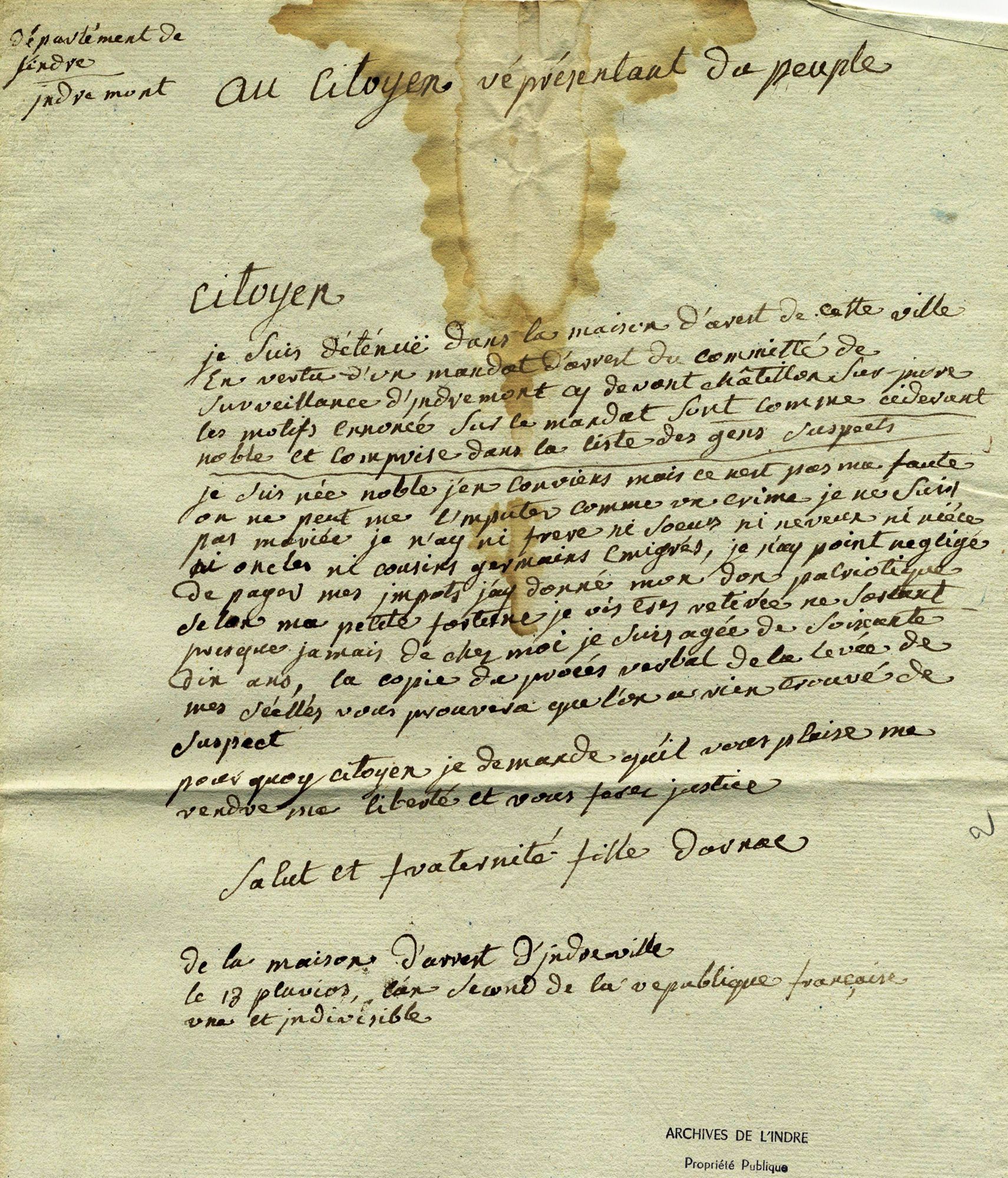 A partir de l’été 1793 le gouvernement révolutionnaire lance un régime d’exception face à la montée des périls. Cette « Terreur » se déploie alors dans l’Indre comme dans le reste du pays par l’instauration de comités de surveillance chargés de dresser, chacun dans son arrondissement, la liste des gens suspects, et de décerner contre eux des mandats d'arrêt. Sont alors considérés comme suspectes toutes les personnes susceptibles de nuire à la Révolution dans une acceptation très large puisque l’article 2 mentionne notamment « ceux des ci-devants nobles, ensemble les maris, femmes, pères, mères, fils ou filles, frères ou sœurs, et agents d'émigrés, qui n'ont pas constamment manifesté leur attachement à la révolution ». C’est bien en tant que noble que Marie Anne d’Arnac a été arrêtée comme elle le souligne dans une lettre envoyée le 1er février 1794 (treize pluviôse an II de la République) au représentant du peuple à Châteauroux. Elle se présente alors comme une vieille femme isolée n’ayant ni fortune ni famille. Afin de convaincre son interlocuteur elle rappelle qu’elle est certes noble mais que ce n’est pas un crime et que rien n’a été trouvé chez elle qui puisse indiquer qu’elle soit hostile à la Révolution. Elle souligne également qu’elle paie sa contribution patriotique et poursuit sa missive en demandant que la liberté lui soit rendue. Enfin, elle achève sa lettre par un « Salut et fraternité » et précise la date en mentionnant « l’an II de la république française une et indivisible ». L’utilisation de ce vocabulaire politique emblématique de la période révolutionnaire pose question : Marie d’Arnac est-elle vraiment sincère et pénétrée d’une vive conscience politique ou cherche-t-elle à amadouer ses geôliers ? Quoiqu’il en soit, elle sera rapidement libérée et retrouvera sa liberté quelques semaines plus tard.