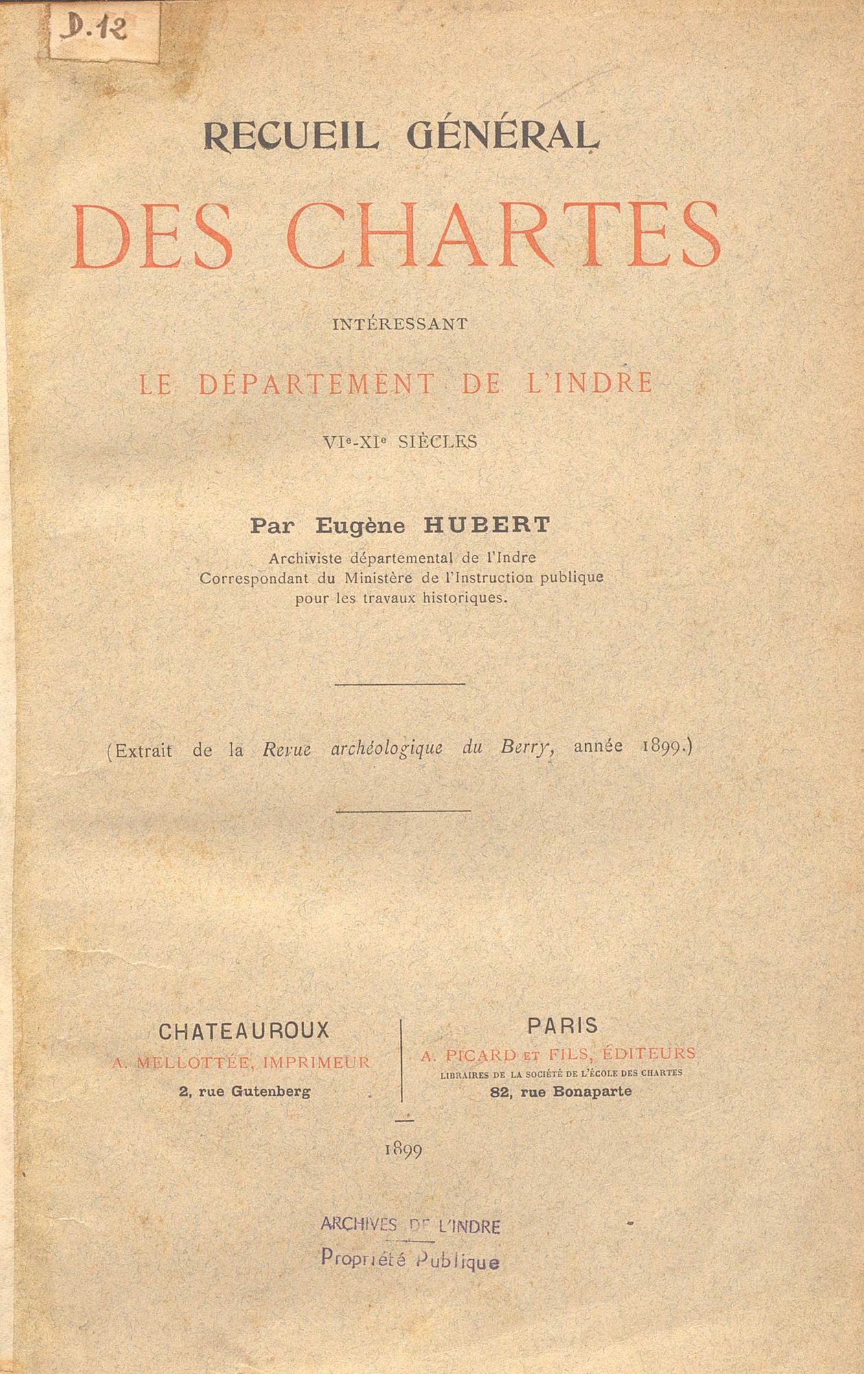 Le Recueil général des chartes intéressant le département de l'Indre (VIe-XIe siècles) (BIB D 325), oeuvre de l'archiviste de l'Indre Eugène Hubert, fut publié en 1899 sous les auspices de la Revue archéologique du Berry. Se trouve rassemblée au sein de ce recueil une sélection des plus anciens actes relatifs au Bas-Berry (correspondant à l'actuel département de l'Indre) de 632 au milieu du XIIe siècle (un appendice regroupe en outre quelques chartes du XIIIe siècle).