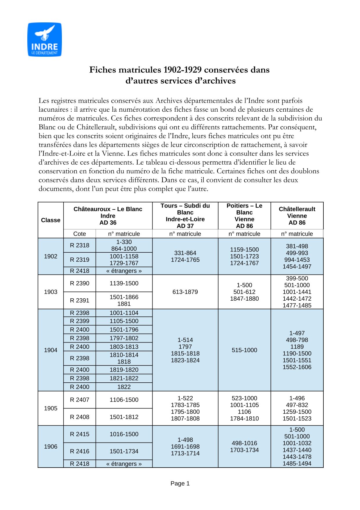 Certaines fiches matricules de la subdivision du Blanc pour la période 1902 à 1929 sont conservées aux Archives départementales d'Indre-et-Loire et de la Vienne. Si un lot de feuillets semble manquer dans un registre, reportez-vous aux sites internet de ces services ou sur le site du Grand Mémorial.