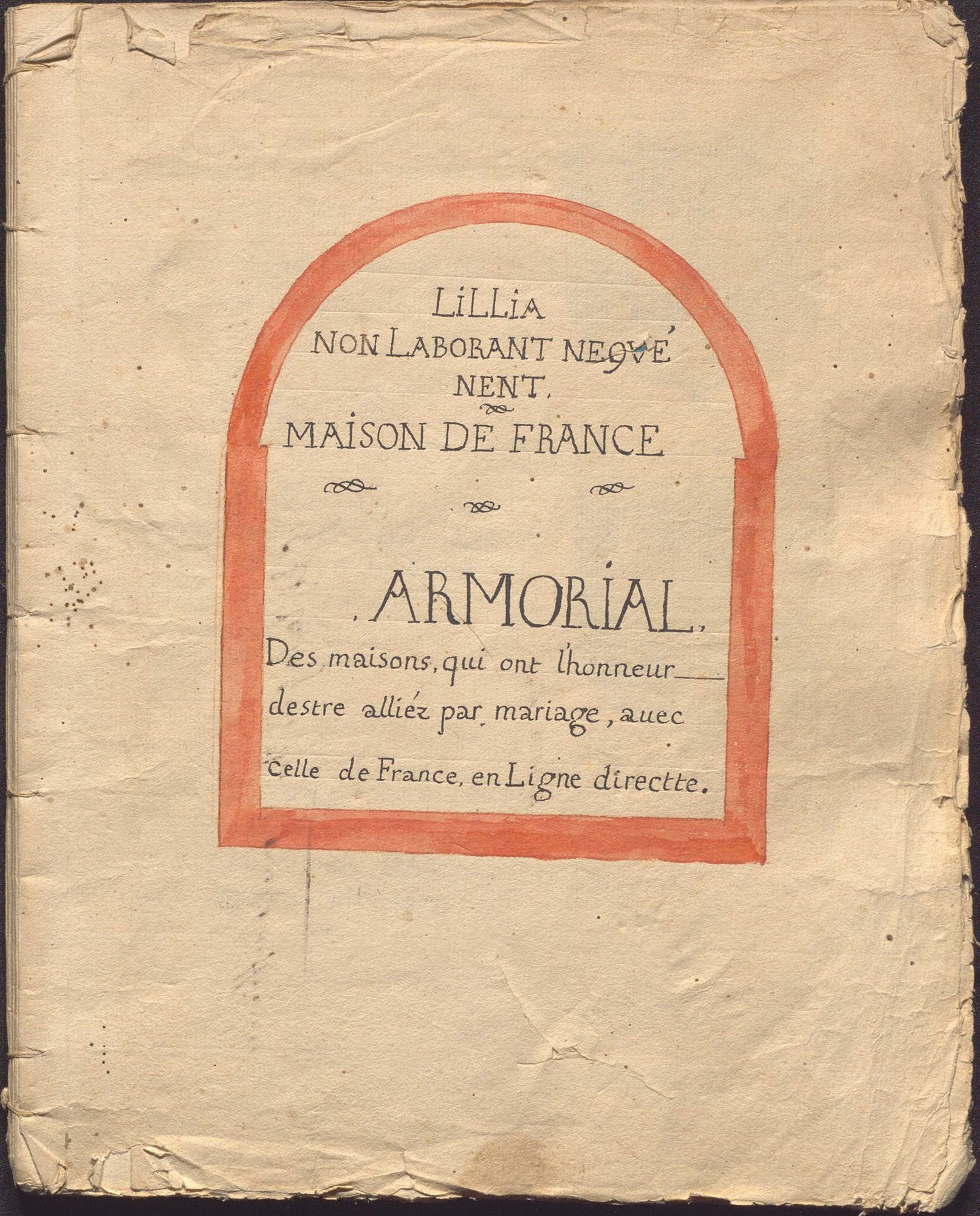 Ce bel armorial provient du chartrier des seigneuries de Prunget et Chabenet (9 J), sous la cote provisoire 9 J 43. Les armes des familles alliées à la maison de France y sont reproduites sur papier. L'artiste a préparé ses dessins à la mine de plomb, puis à l'encre, et réalisé les couleurs à l'aquarelle. Les dernières pages sont inachevées, et témoignent de la manière de travailler de l'artiste. Chaque écu est surmonté du nom de la famille. Le blasonnement des armes est noté à gauche de chaque écu, avec parfois quelques éléments généalogiques.