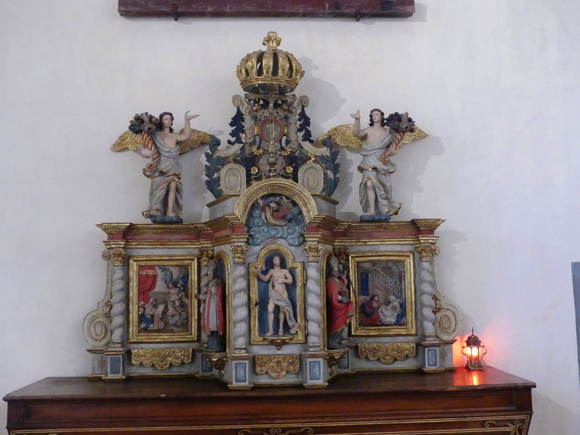 Au-dessus, une ancienne poutre triomphale ou poutre de gloire, originellement placée à l’entrée du choeur ou au-dessus du jubé et désormais située dans le chœur de l’église, représente un groupe polychrome. L’architecture du calvaire comprend une poutre sur laquelle est fixée une croix étayée par deux arcs en bois avec crochets et décor de trèfles et flammèches. Le Christ est entouré de la Vierge debout les mains jointes et de saint Jean, les mains croisées sur la poitrine, le regard tourné vers lui. Classé au titre des Monuments historiques par arrêté du 5 décembre 1908, cet objet daterait de la fin du XVe siècle et du premier quart du XVIe siècle.