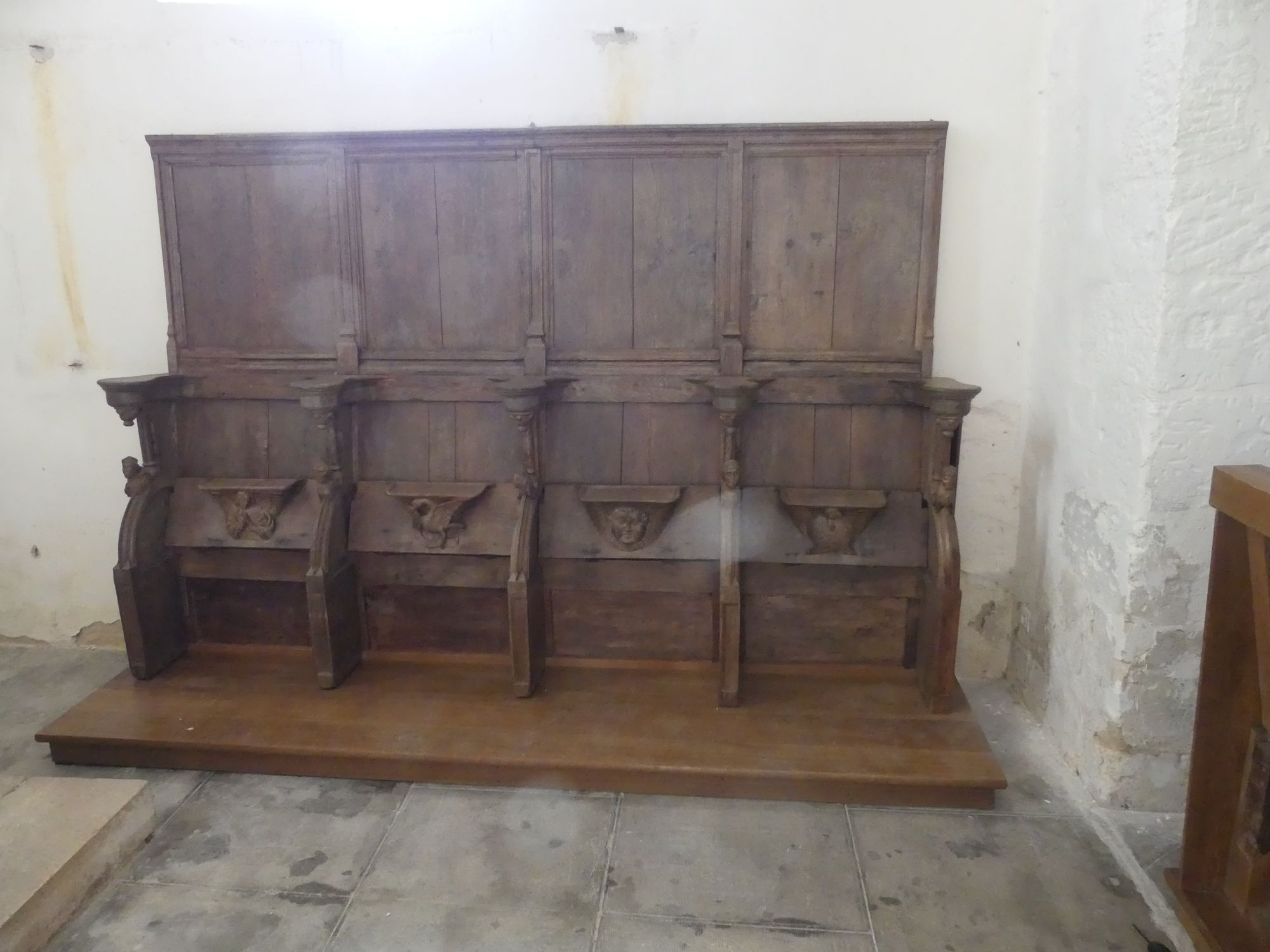 Compte tenu de la taille de chaque sous-ensemble et de la configuration des lieux, cette présentation a cependant nécessité une modification de la répartition initiale des stalles. En effet, le rang de quatre stalles basses, trop long, ne pouvait être placé dans un passage, il a donc été inversé avec le rang de trois stalles hautes. Cette modification a permis de conserver l’ensemble des dorsaux et est esthétiquement plus satisfaisante.