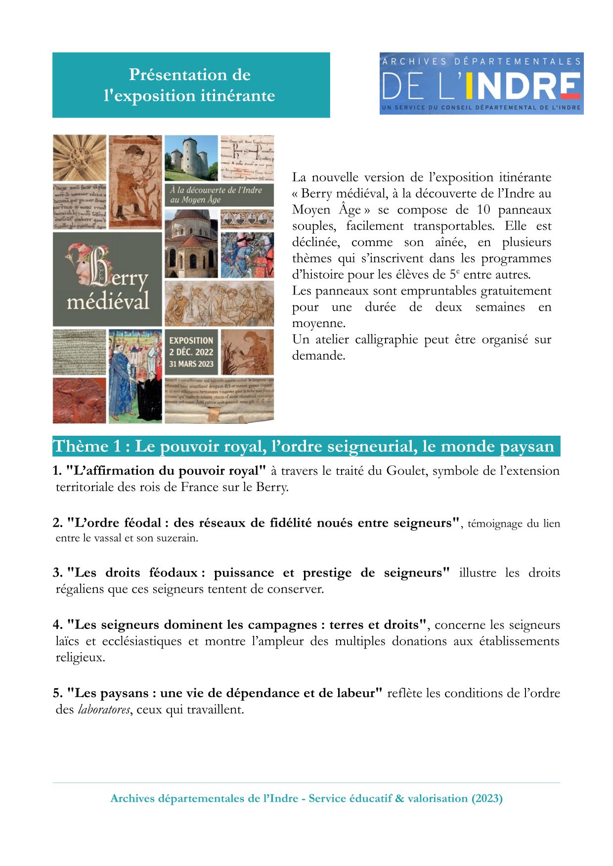 L'exposition « Berry médiéval, à la découverte de l’Indre au Moyen Âge » a été présentée aux Archives départementales du 2 décembre 2022 au 31 mars 2023. Elle était agrémentée d’objets d’art remarquables : chapiteaux de l’abbaye de Déols, châsse en émail limousin de Sazeray conservée au musée Bertrand, croix de Lye en émail limousin, sculptures représentant deux pleurants provenant de l'église de Pruniers (aujourd'hui au Musée Saint-Roch d'Issoudun) et un ensemble de parchemins originaux, témoignages de l’histoire des hommes et des établissements religieux du sud Berry, conservés aux Archives départementales.