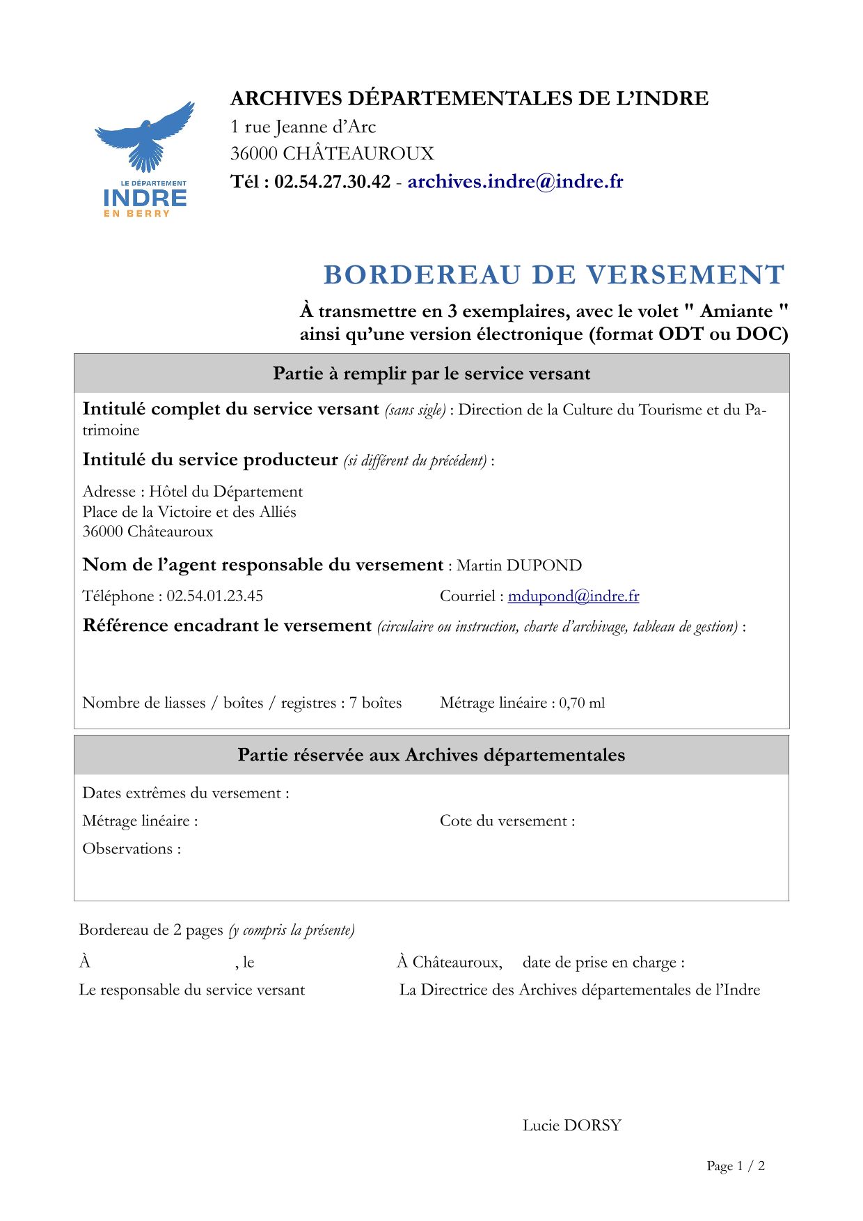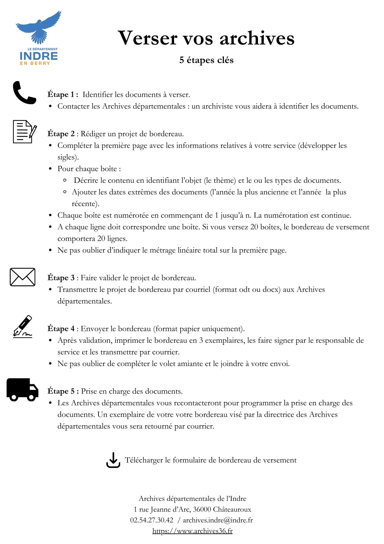 Le bordereau de versement doit être rédigé en trois exemplaires originaux sur papier, qui seront adressés aux Archives départementales (1 rue Jeanne d'Arc, 36000 Châteauroux). Une version électronique du bordereau (format modifiable type odt) vous sera également demandée.