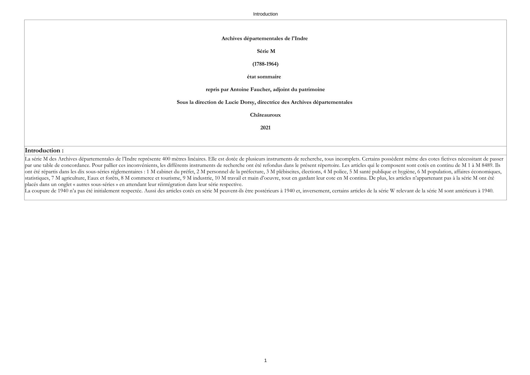 La série M de l'Indre, cotée depuis l'origine en continu (cotation du type M 1, M 2, etc.) et dotée d'analyses succinctes, a fait l'objet à partir de 1956 de plusieurs tentatives de recotation destinées à réorganiser les documents par sous-séries réglementaires. En 1969 et dans les années 1980, on réintégra en série M des registres et des liasses de correspondance initialement classés en série K. Au cours de ces opérations, des cotations "virtuelles" (du type 2 M 1) furent attribuées aux articles, qui restaient cependant cotés en continu en magasin. Par ailleurs, de nombreux documents relevant de la série M et tardivement entrés aux Archives départementales ont alors été intégrés aux archives contemporaines, où ils se trouvent toujours conservés.