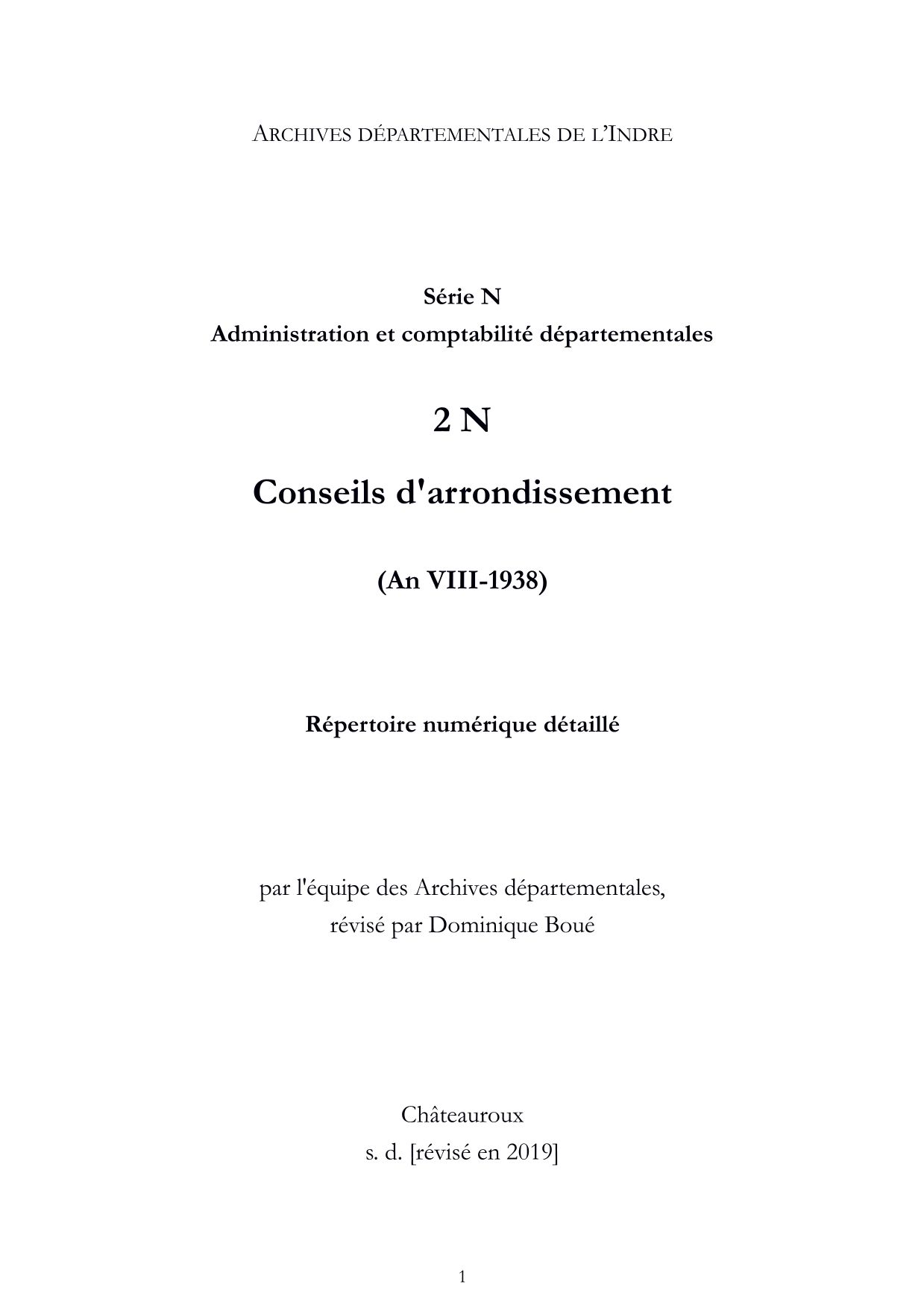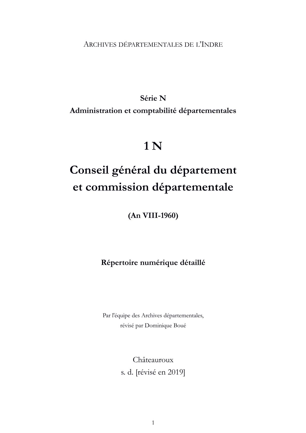 - Conseil général du département et commission départementale [1 N] : sessions, délibérations, rapports (une seconde collection des rapports et délibérations du conseil départemental de l'Indre est conservée (1 N 1-80).