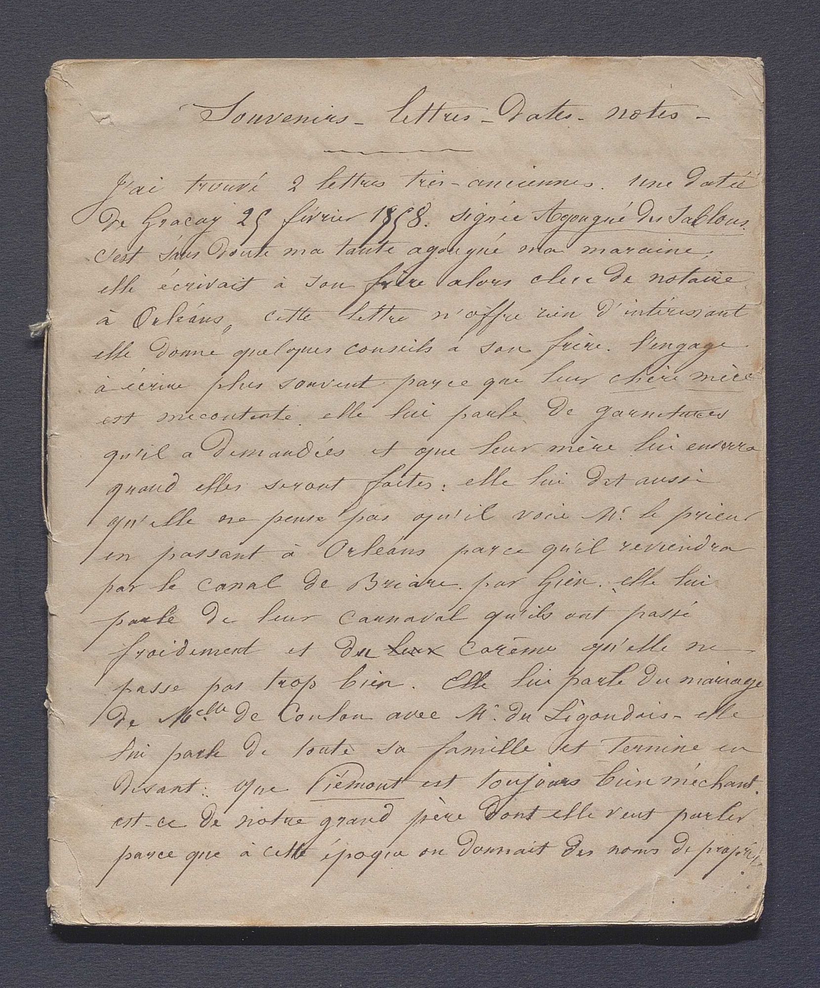 - Carnet intitulé "Souvenirs, lettres, dates, notes" contenant notamment des transcriptions de lettres, XIXe siècle.