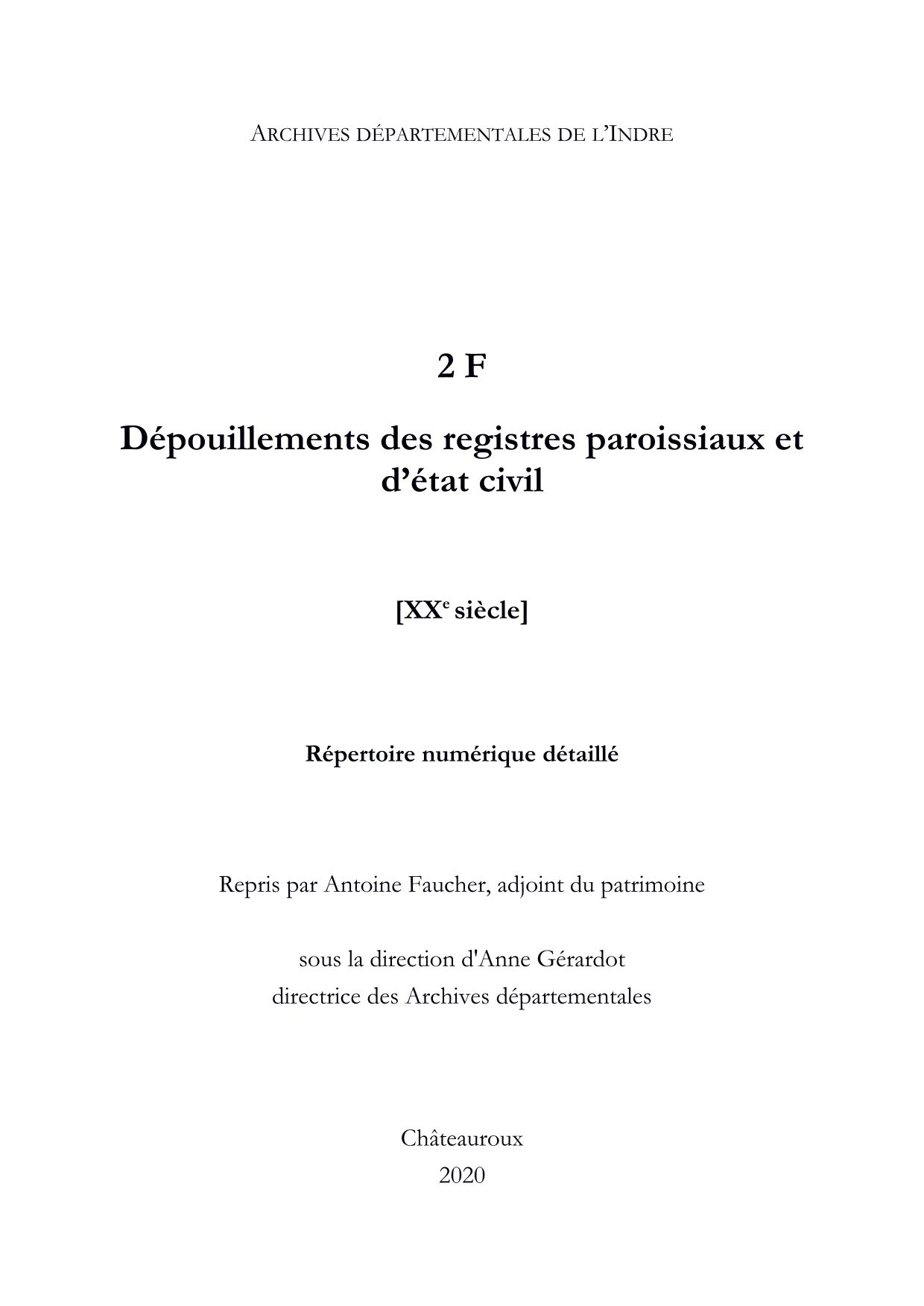 La sous-série 2 F contient des dépouillements des registres paroissiaux et d'état civil de l'Indre, réalisés par la Société généalogique du Bas-Berry, librement consultables.