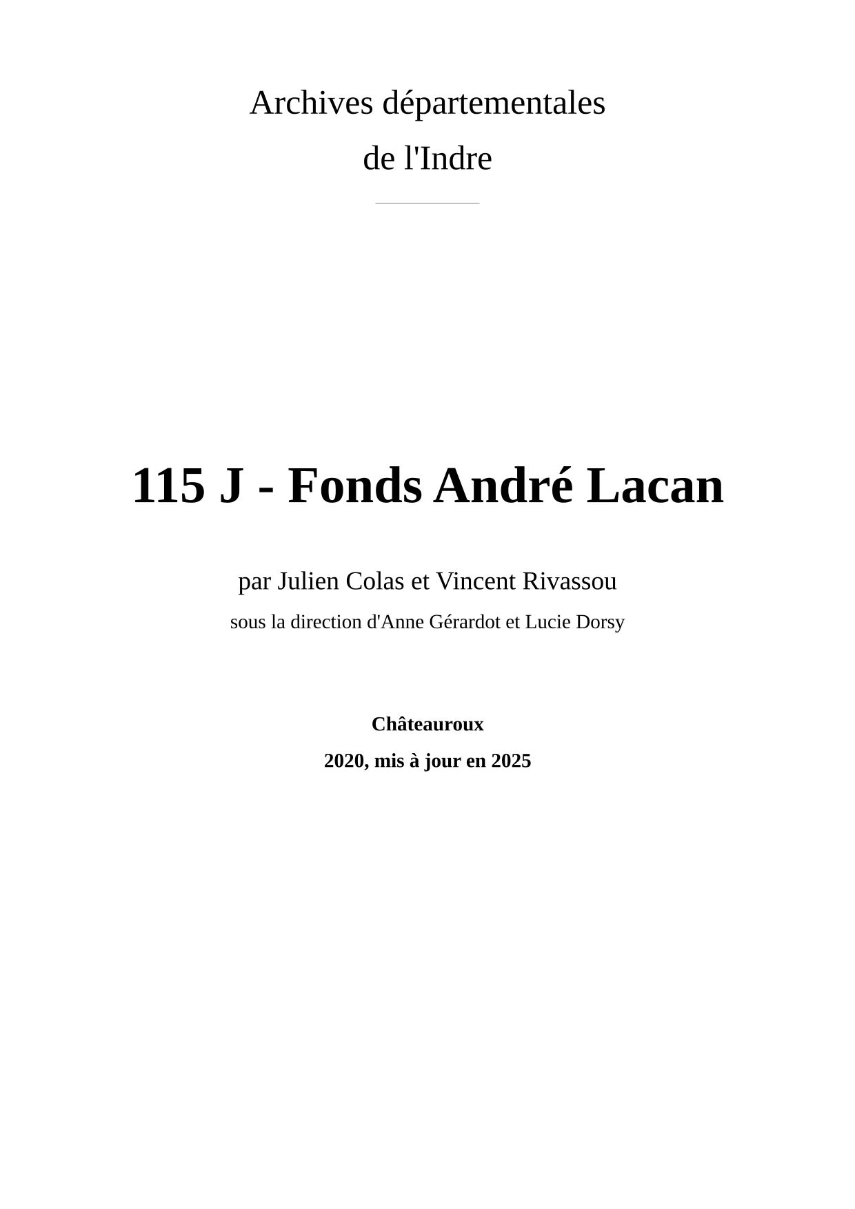 Ce fonds contient une partie des archives de maître André Georges Yves Lacan, avocat au barreau de Châteauroux. André Lacan ayant exercé durant la Seconde guerre mondiale, la majeure partie des dossiers concernent des procédures engagées à la suite d'événements survenus durant le conflit et touchant notamment à des faits de collaboration ou à des spoliations. Ainsi ce petit fonds constitue-t-il une ressource d'un grand intérêt sur cette période.