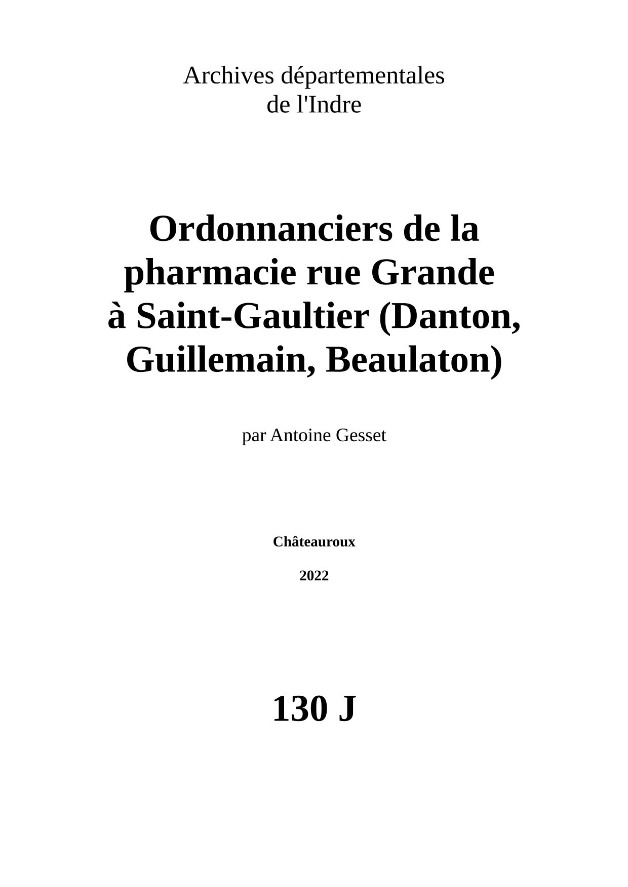 Ce petit fonds est constitué uniquement d'ordonnanciers provenant de la pharmacie rue Grande à Saint-Gaultier. Ils ont été successivement tenus par Etienne Danton, Mlle Guillemain et M. Beaulaton. Bien que M. Danton ait exercé à Saint-Gaultier depuis 1899, les registres ne commencent qu'en 1907, les précédents n'ayant sans doute pas été conservés. Mlle Guillemin prend la suite de M. Danton en 1932, pour trois ans seulement, avant de laisser la place à M. Beaulaton en 1935 (renseignements tirés de l'Annuaire statistique, historique et topographique du département de l’Indre, PRA 26).