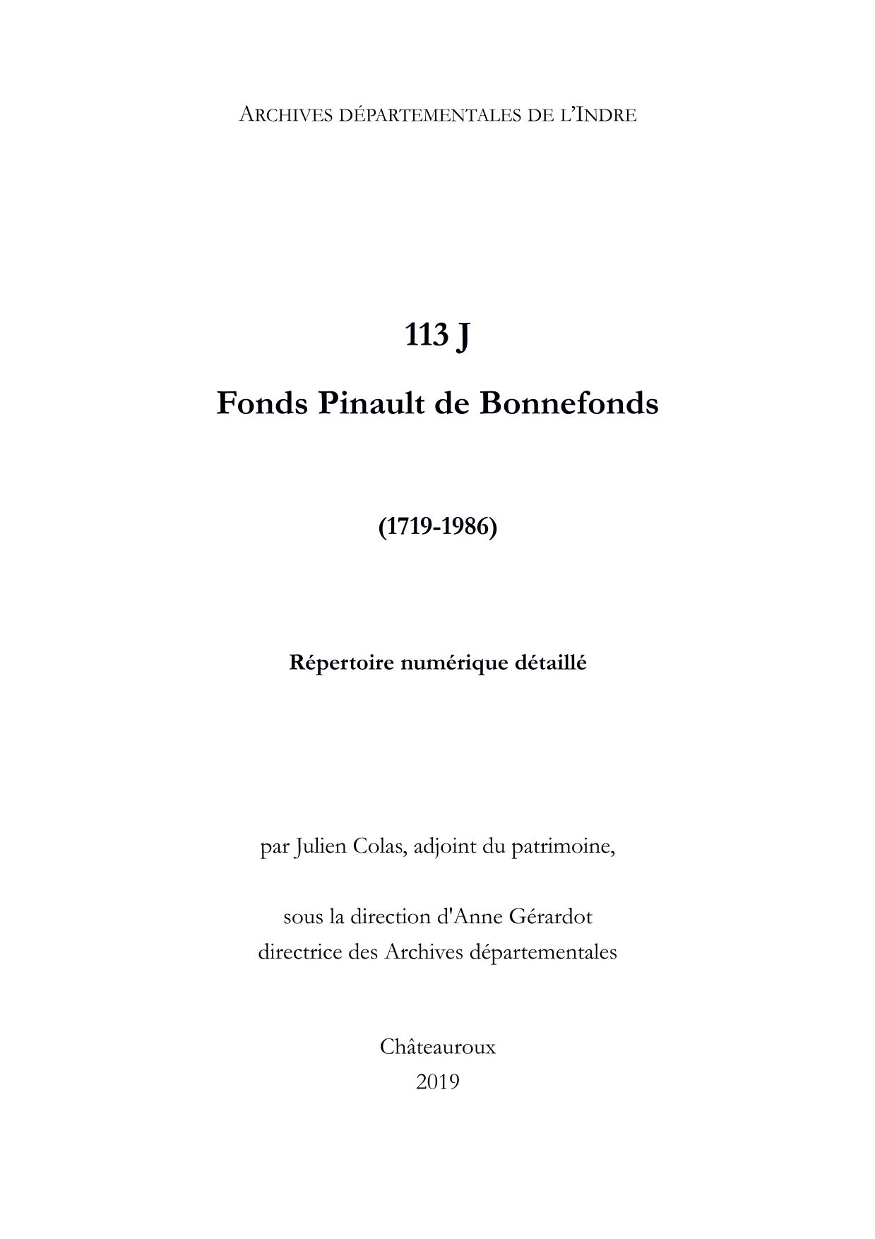 Ce petit fonds contient des papiers provenant de la famille Pinault de Bonnefonds, propriétaire de domaines au Blanc et à Douadic, et notamment le livre de raison de Jean Pinault de Bonnefonds, tenu à jour de 1750 à 1808, qui constitue une source précieuse sur la période révolutionnaire dans les environs du Blanc, la gestion des propriétés familiales et l'histoire de la famille.