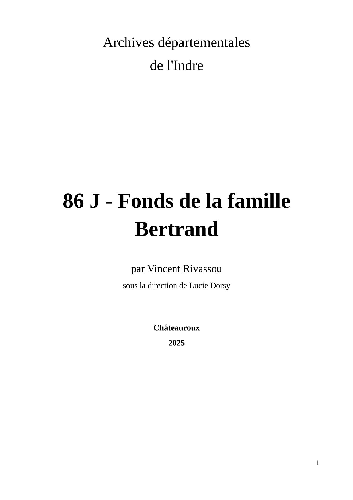 Cet ensemble de documents concernant la famille Bertrand, acquis en vente publique, contient des papiers concernant le général Henri-Gation Bertrand (1773-1844), fidèle serviteur de Napoléon Ier, nommé grand maréchal du Palais en 1813, qui accompagna l'empereur à l'île d'Elbe, puis à Sainte-Hélène, et plusieurs autres membres de sa famille : papiers de famille, correspondance, procédures, travaux historiques, livres et revues.