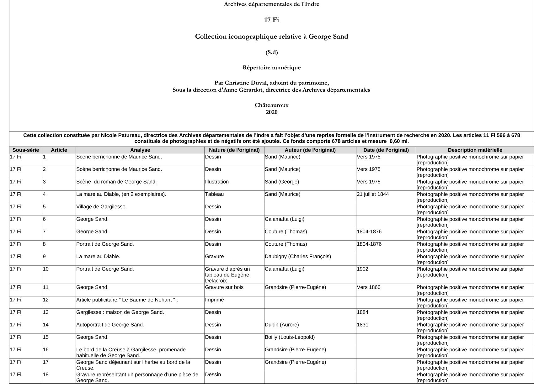 Cette collection de reproductions de documents relatifs à George Sand a été constituée par Nicole Patureau, directrice des Archives départementales de l’Indre de 1967 à 1992. L'instrument de recherche a fait l’objet d’une reprise formelle en 2020. De plus, les articles 11 Fi 596 à 678 constitués de photographies et de négatifs y ont été ajoutés.